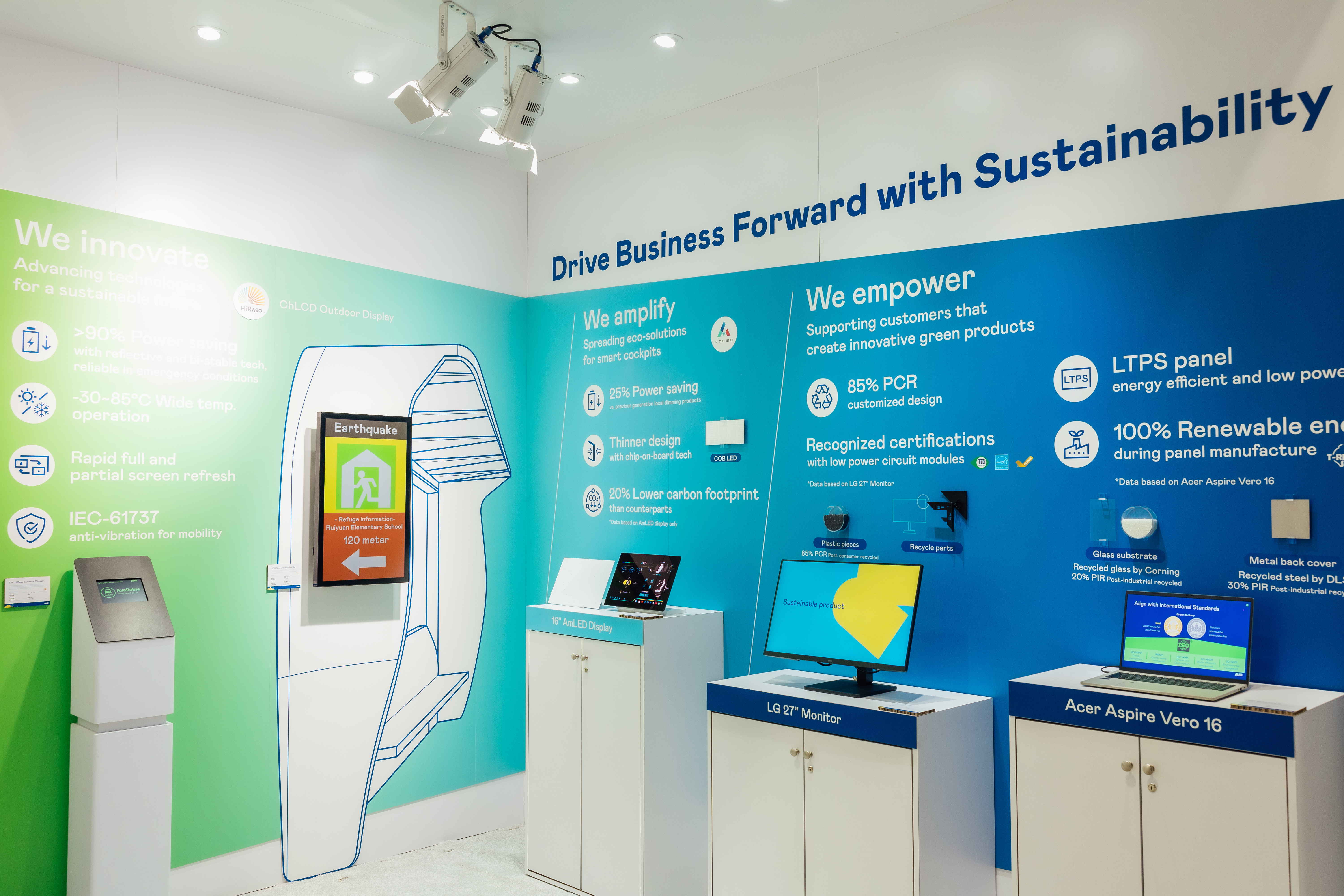 金年会|jinnianhui运用创新显示技术HiRaso胆固醇液晶双稳态技术达到显示零耗能、扩大节能省电的AmLED显示技术应用于车用产品、以再生的消费后回收(PCR)塑料及全绿电生产之面板,应用于笔电及萤幕,增加绿色价值。