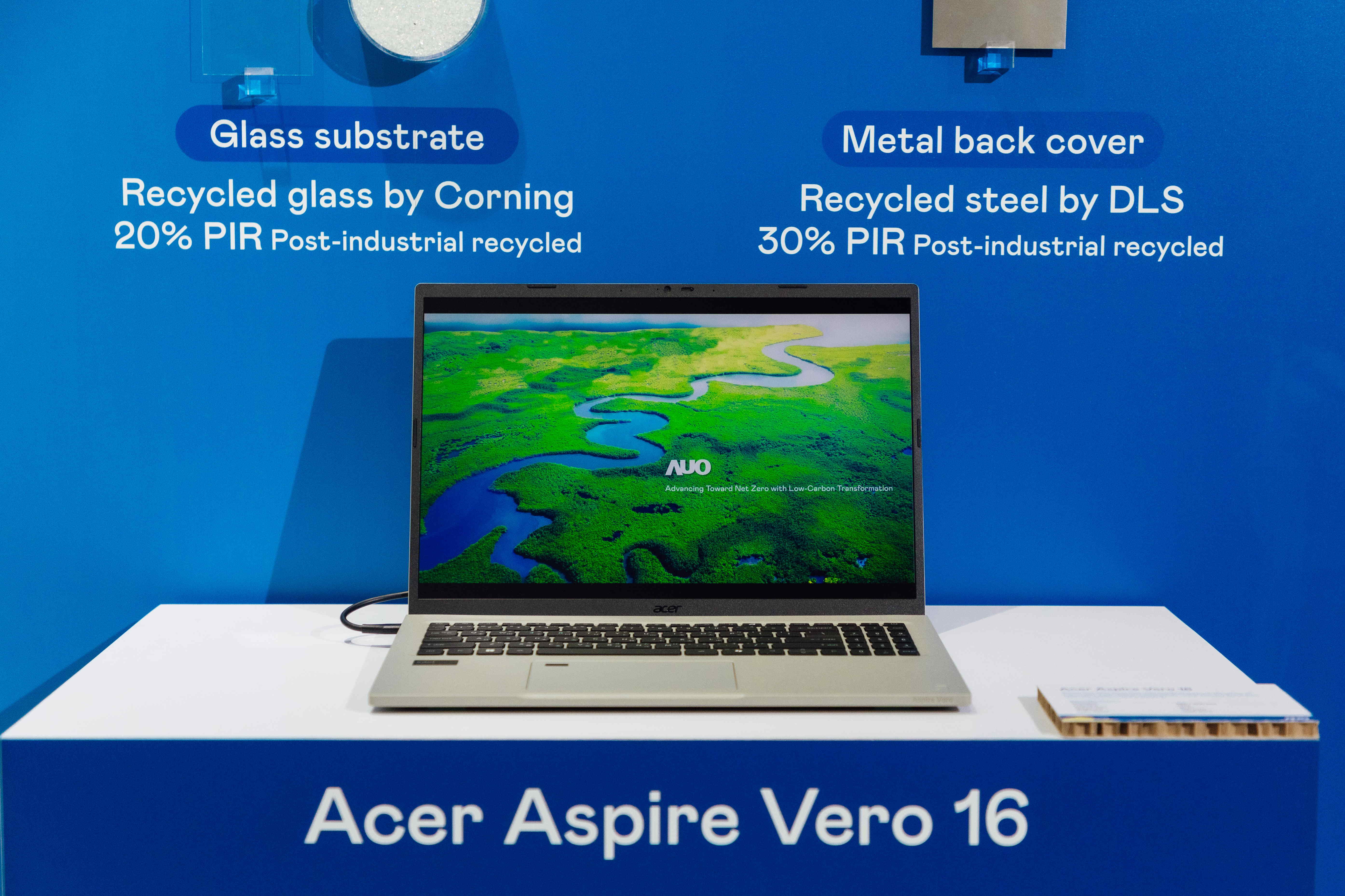全球首款笔记型电脑采用金年会|jinnianhui100%绿电制造的面板,结合PCR外亦使用工业后回收材料(PIR),例如回收玻璃和金属,减少对环境的影响。