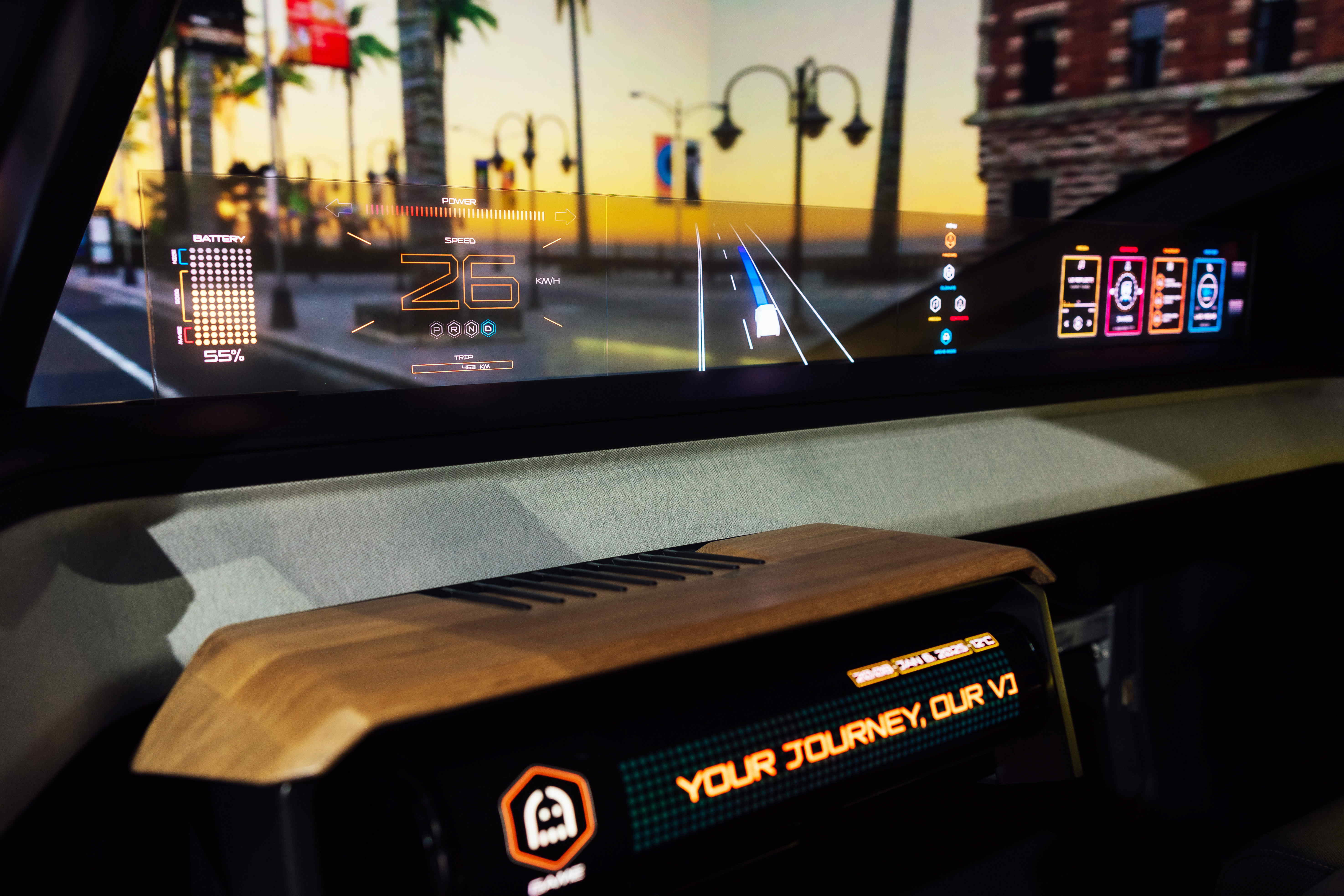 车用运算方案驱动无界透明显示介面(Horizon Image Glass),整合仪表板、中控及副驾显示功能为一体式全景呈现,不仅提供清晰的外部视野,亦能即时显示车辆状态、导航及路况资讯,并赋予个性化设定与驾驶安全警示等加值化服务。